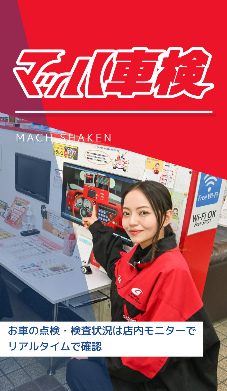 マッハ車検は45分で車検終了。車検時のお客さまの待ち時間をできる限り短縮するため、極限まで作業の効率化を計り、短時間での車検を実現しました。点検・整備は、国家資格を持った整備士が同時進行で丁寧に作業を行い、早さと高品質を両立した内容となっています。