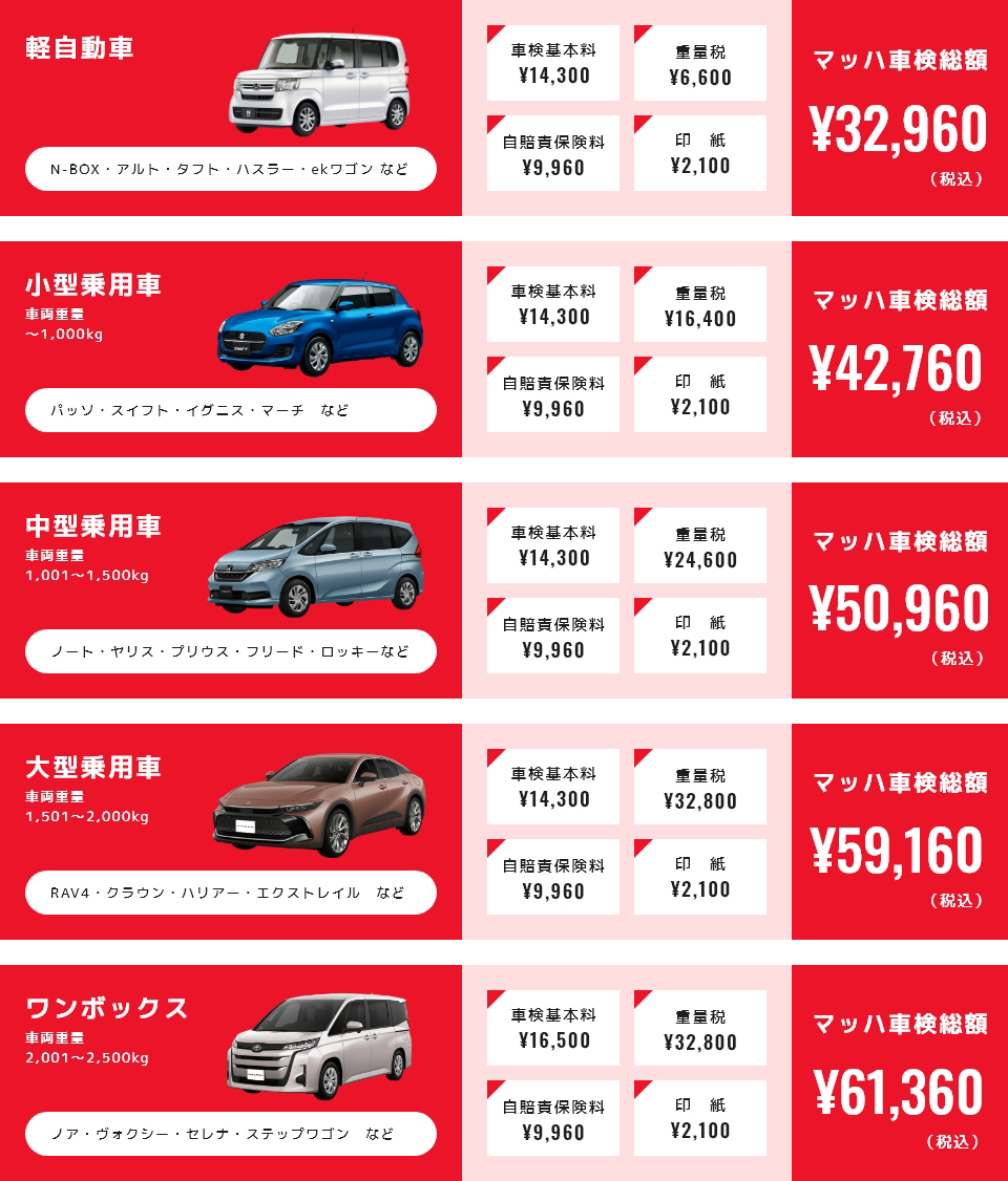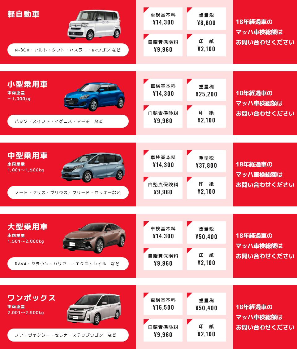 ※ハイエースやランドクルーザー等の大型車につきましては、作業時間および設備の関係上、マッハ車検での対応が難しいため受付を行っておりません。あらかじめご了承ください。